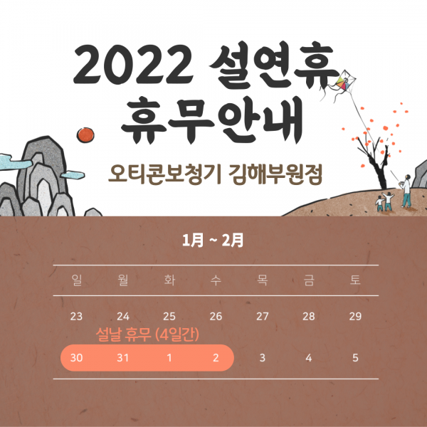 1월 30일(일)부터 2월 2일(수)까지 총 4일 간 휴무입니다.